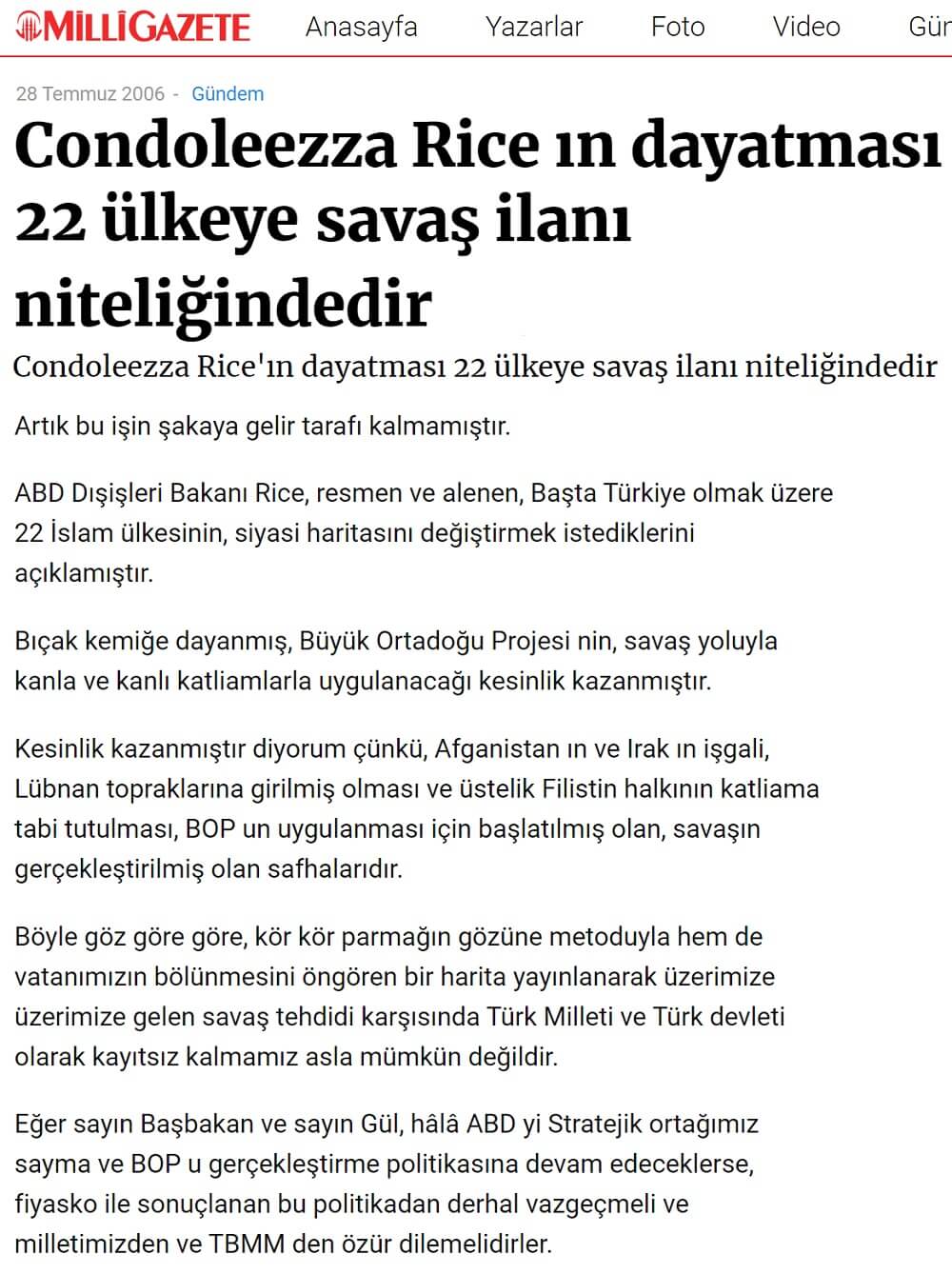 "Zira adamlar açık açık BOP projesi ile Türkiye'nin de dahil olduğu 22 ülkenin sınırlarının değişeceğini, dönemin ABD Dışişleri Bakanı Condoleezza Rice'in 07 Ağustos 2003'te Washington Post gazetesindeki makalesinde; "Büyük Ortadoğu Projesi ile Türkiye dahil 22 ülkenin sınırlarını değiştireceğiz" ifadesiyle açıkça söylemişti."