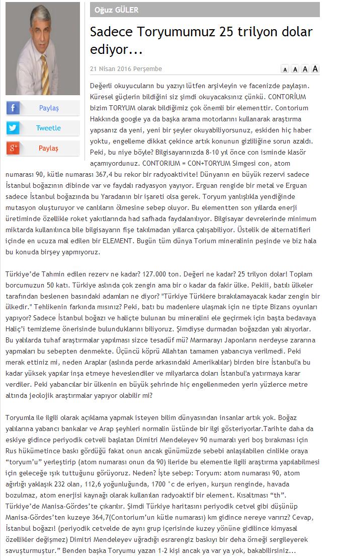 Anayurt Gazetesi’nden Oğuz Güler, “Sadece Toryumumuz 25 trilyon dolar ediyor…” başlıklı 21 Nisan 2016 tarihli yazısında contorium palavrasına balıklama atlamış.