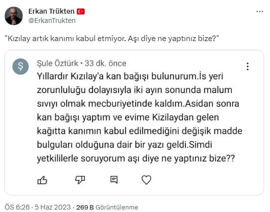 “Yıllardır Kızılay’a kan bağışı bulunurum. İş yeri zorunluluğu dolayısıyla iki ayın sonunda malum sıvıyı olmak mecburiyetinde kaldım. Aşıdan sonra kan bağışı yaptım ve evime Kızılaydan gelen kağıtta kanımın kabul edilmediğini değişik madde bulguları olduğuna dair bir yazı geldi. Şimdi yetkililere soruyorum aşı diye ne yaptınız bize?”