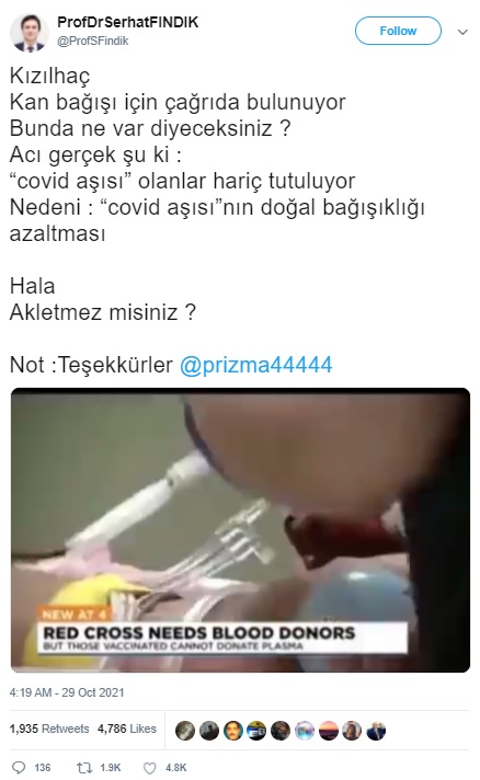 Serhat Fındık: “Kızılhaç Kan bağışı için çağrıda bulunuyor Bunda ne var diyeceksiniz ? Acı gerçek şu ki : “covid aşısı” olanlar hariç tutuluyor Nedeni : “covid aşısı”nın doğal bağışıklığı azaltması Hala Akletmez misiniz ?”