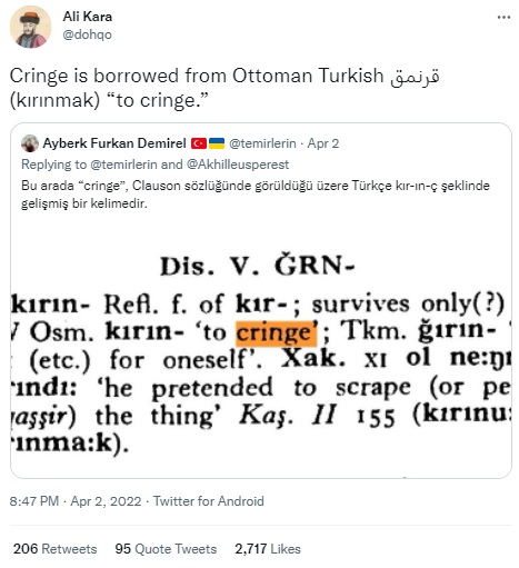 (“Bu arada “cringe”, Clauson sözlüğünde görüldüğü üzere Türkçe kır-ın-ç şeklinde gelişmiş bir kelimedir.” ifadelerini içeren paylaşımın alıntılandığı) “Cringe, Osmanlı Türkçesindeki ‘kırınmak’tan alınmıştır” anlamındaki “Cringe is borrowed from Ottoman Turkish قرنمق (kırınmak) “to cringe.”” tweeti bu algıya yol açmıştı. Ancak, ciddiye alınan bu paylaşım aslında bir “şaka” imiş.