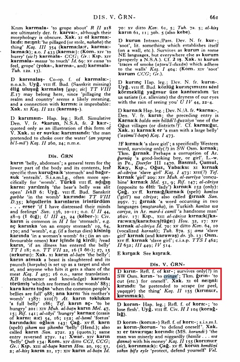 “1) klrin- Refl. f. of krr-; survives only(?) in SW Osm. klrm- ‘to cringe’; Tkrn. &in- ‘to cut (etc.) for oneself’. Xak. xr 01 ne:gni: krr~ndl: ‘he pretended to scrape (or peel, yuqappir) the thing’ Kag. 11 155 (klrlnu:r, 1urmma:k).”