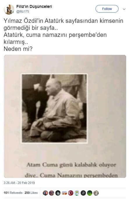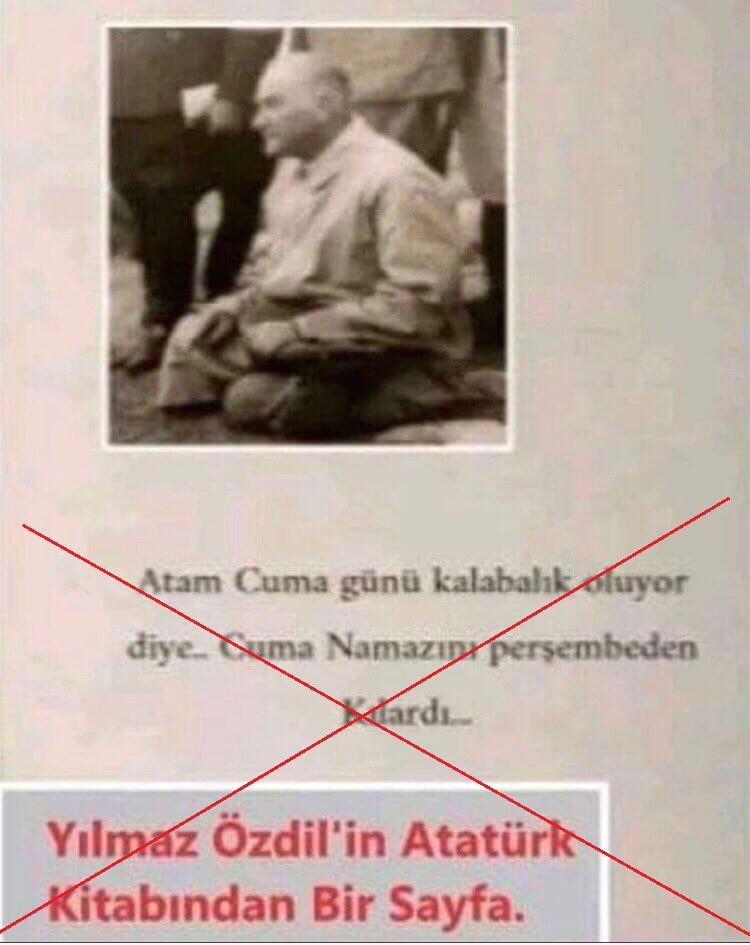 Yılmaz Özdil’in Mustafa Kemal adlı kitabının 2.500,00 TL karşılığı satışa sunulmasıyla birlikte yöneltilen eleştirilerin ardından Atatürk karşıtı trollerin sosyal medyada “Yılmaz Özdil’in Atatürk kitabından bir sayfa” olduğu iddiasıyla üzerinde “Atam Cuma günü kalabalık oluyor diye… Cuma namazını perşembeden kılardı…” notunu ve Atatürk’ün otururken görüldüğü fotoğrafı taşıyan görseli paylaştığı görülüyor.