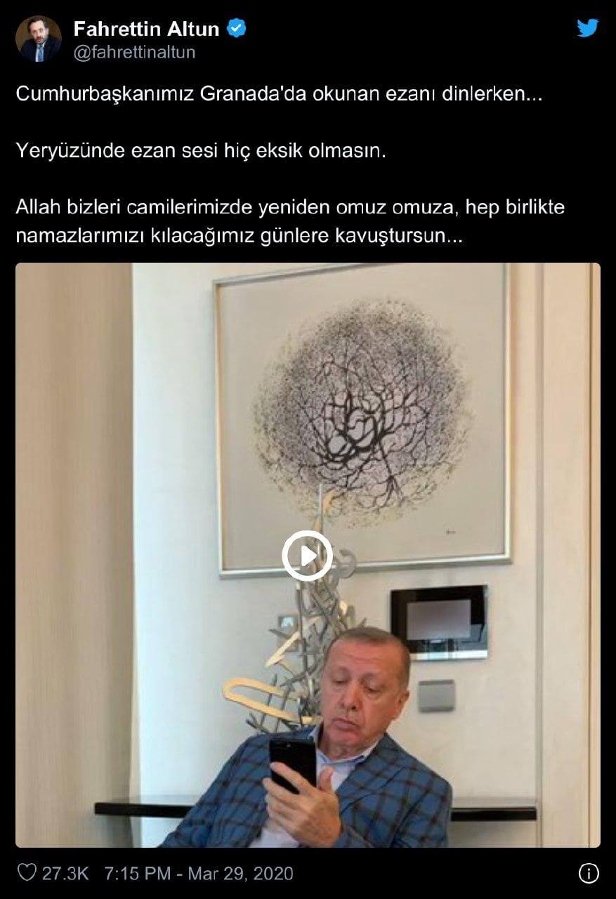 Cumhurbaşkanlığı İletişim Başkanlığı görevini yürüten, Sabah Gazetesi eski köşe yazarı Fahrettin Altun, 29 Mart 2020 tarihinde sosyal medya hesabından yaptığı paylaşımda Cumhurbaşkanı Recep Tayyip Erdoğan’ın ezan okunan bir video kaydını izlerkenki görüntüsünü paylaşmış ve “Cumhurbaşkanımız Granada’da okunan ezanı dinlerken…” notunu düşmüştü.
