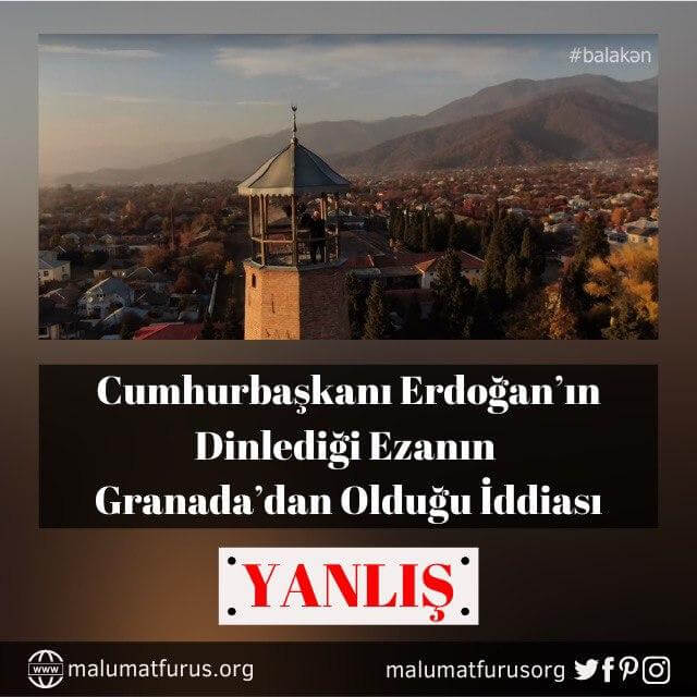 Cumhurbaşkanı Recep Tayyip Erdoğan’ın mobil cihazdan dinlerken görüntülendiği ve İspanya Granada’da okunduğu sanılan ezan Azerbaycan’ın Balaken şehrinden. Okuyan kişi İranlı müzisyen Mehdi Yarrahi.