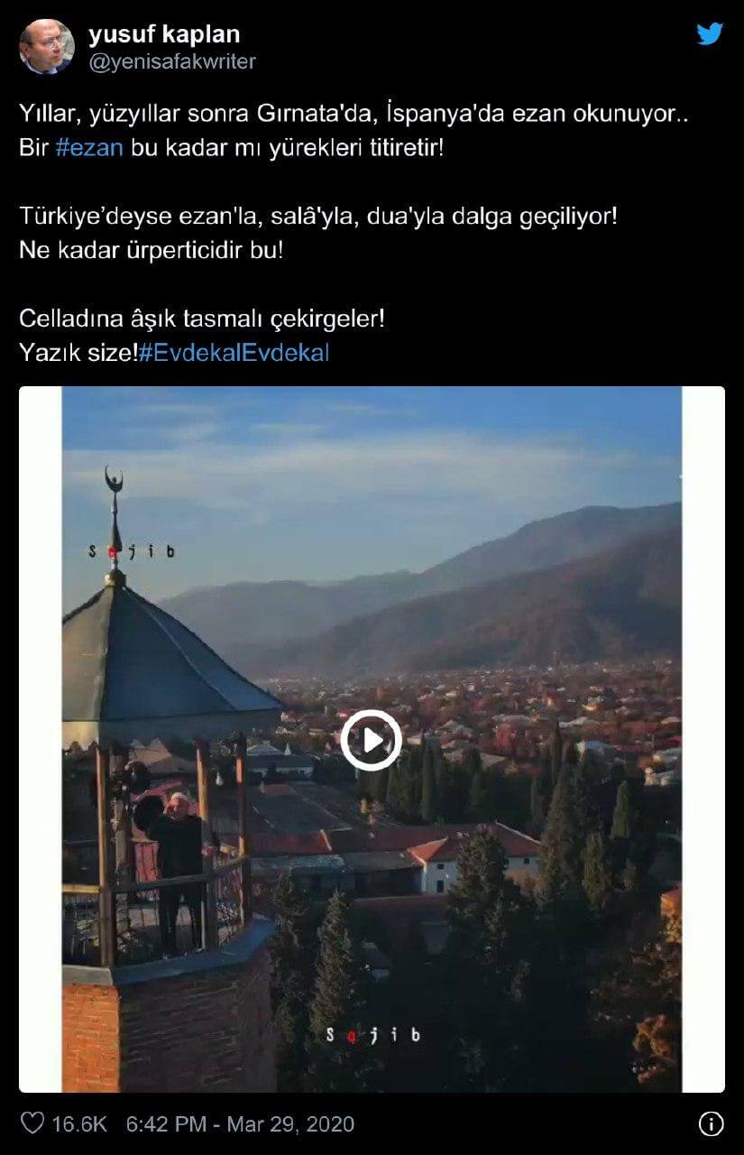 "Yıllar, yüzyıllar sonra Gırnata'da, İspanya'da ezan okunuyor.. Bir #ezan bu kadar mı yürekleri titiretir! Türkiye’deyse ezan'la, salâ'yla, dua'yla dalga geçiliyor! Ne kadar ürperticidir bu! Celladına âşık tasmalı çekirgeler! Yazık size!"