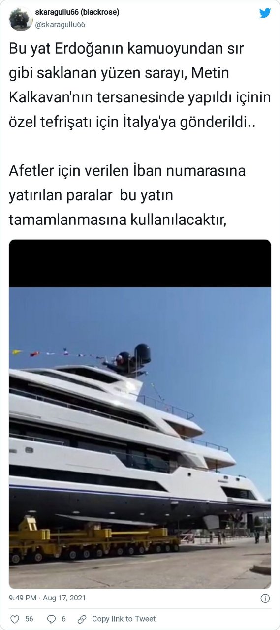 “Bu yat Erdoğanın kamuoyundan sır gibi saklanan yüzen sarayı, Metin Kalkavan’nın tersanesinde yapıldı içinin özel tefrişatı için İtalya’ya gönderildi.. Afetler için verilen İban numarasına yatırılan paralar bu yatın tamamlanmasına kullanılacaktır,”