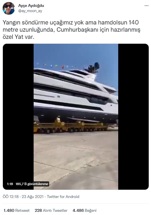 “Yangın söndürme uçağımız yok ama hamdolsun 140 metre uzunluğunda, Cumhurbaşkanı için hazırlanmış özel Yat var.”