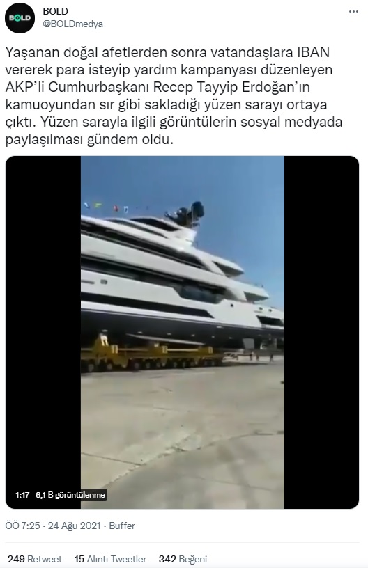 “Yaşanan doğal afetlerden sonra vatandaşlara IBAN vererek para isteyip yardım kampanyası düzenleyen AKP’li Cumhurbaşkanı Recep Tayyip Erdoğan’ın kamuoyundan sır gibi sakladığı yüzen sarayı ortaya çıktı. Yüzen sarayla ilgili görüntülerin sosyal medyada paylaşılması gündem oldu.”