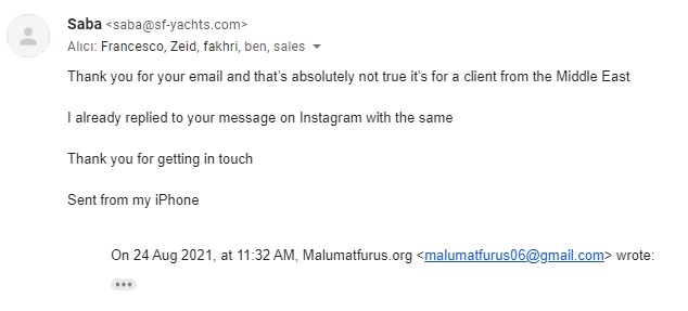 Alia Yachts da SF Yachts’ın açıklamasını teyit edip “Tekzipte geçen bilgiler tümüyle doğru olup, söz konusu projemiz yurtdışındaki bir işadamı için yapılmıştır.” yanıtını sundu.
