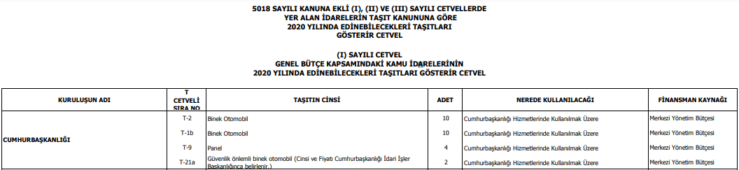 Cumhurbaşkanlığı ve genel bütçe kapsamındaki diğer kamu kuruluşlarının edinebilecekleri taşıt bilgisine Türkiye Cumhuriyeti Cumhurbaşkanlığı Strateji ve Bütçe Başkanlığı tarafından Merkezi Yönetim Bütçe Kanunları başlığı altında açıklanan veriler ile ulaşılabiliyor. 2020 yılı için yayınlanan “5018 Sayılı Kanuna Ekli (I), (II) ve (III) Sayılı Cetvellerde Yer Alan İdarelerin Taşıt Kanununa Göre 2020 Yılında Edinebilecekleri Taşıtları Gösterir Cetvel” başlıklı veriye göre cumhurbaşkanlığı araç filosuna edinilebilecek bir cenaze aracının varlığına rastlanılmıyor.