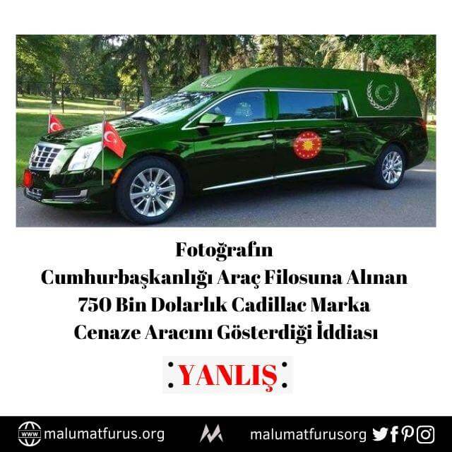 Cumhurbaşkanlığı araç filosuna katılan 750 bin dolarlık Cadillac marka cenaze aracı alındığı iddiası gerçeği yansıtmıyor. Bahse konu fotoğraf ABD’de cenaze aracı kirayalan bir firmaya ait. Fotoğraftaki aracın üzerinde yer alan Türk bayrakları ve Cumhurbaşkanlığı forsu sonradan eklenmiş. Cumhurbaşkanlığı ve genel bütçe kapsamındaki diğer kamu kuruluşlarının edinebilecekleri taşıt bilgisinde de söz konusu cenaze aracının varlığına rastlanmıyor.