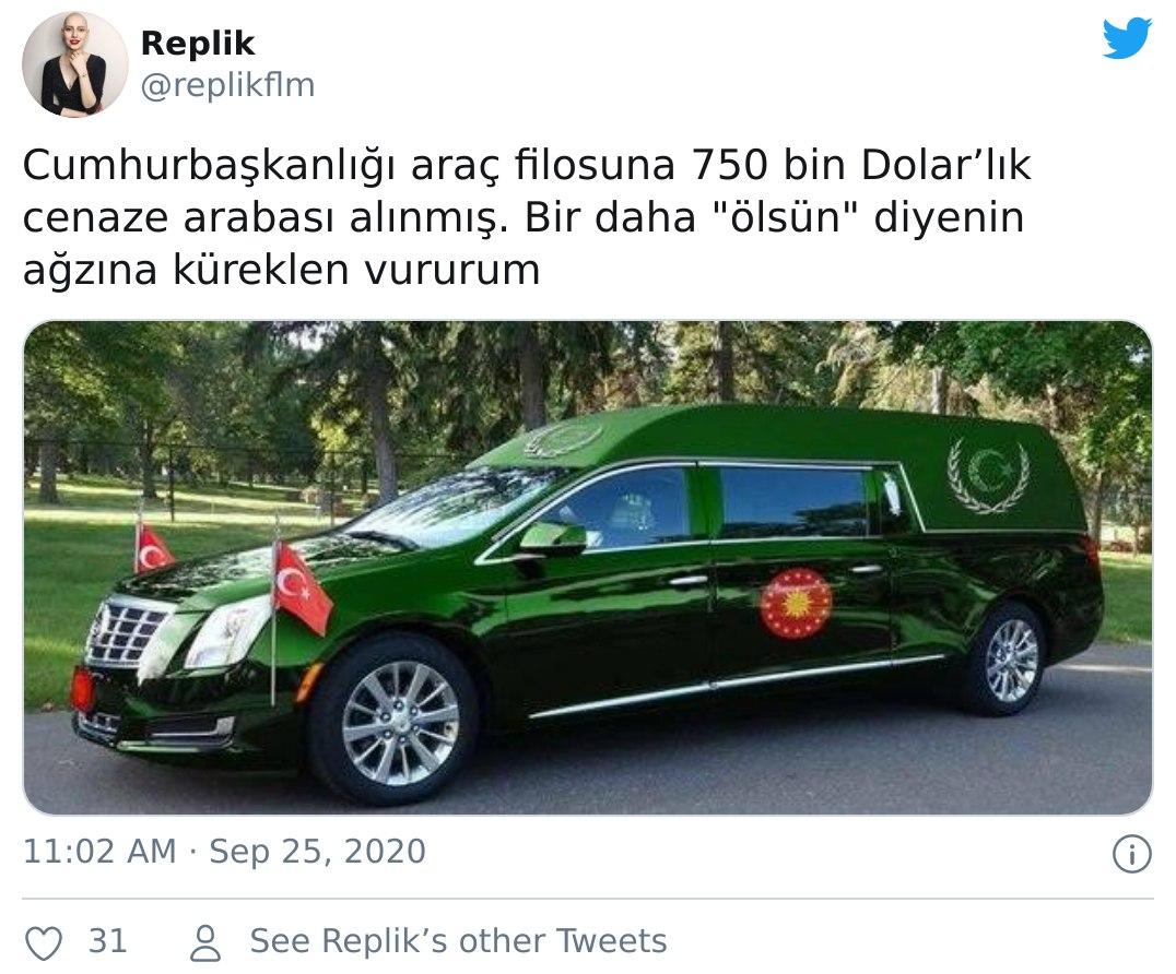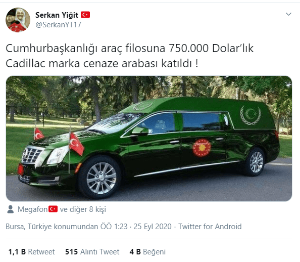 Cumhurbaşkanlığı araç filosuna katılan 750 bin dolarlık Cadillac marka cenaze aracı alındığını gösterdiği iddiasını içeren bazı paylaşımlar şöyle: