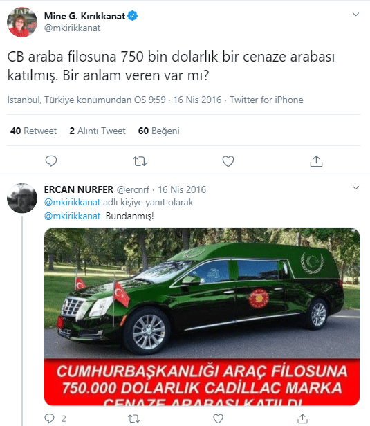 Cumhuriyet Gazetesi yazarlarından Mine Kırıkkanat 16 Nisan 2016 tarihinde sosyal medya hesabından yaptığı paylaşım ile cumhurbaşkanlığı araç filosuna 750 bin dolarlık Cadillac Marka cenaze aracı alındığına dair hataya düşmüştü.