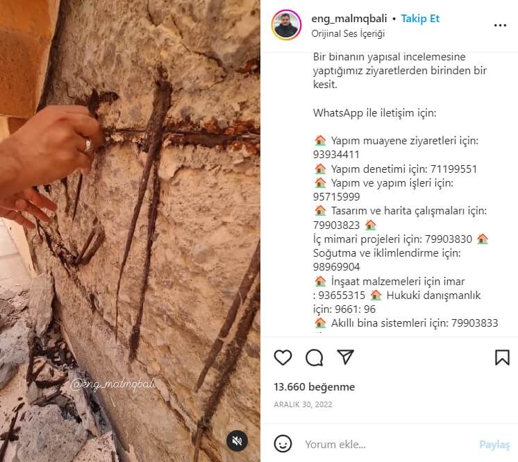 Profilinde “gethor.com’un kurucusu inşaat, sorunları, yapı malzemeleri ile ilgilenen sertifikalı bir müşavir mühendistir ve içeriğin çoğu inşaat sorunları ve çözümleri hakkındadır.” tanıtımını içeren adı geçen kullanıcı bahse konu videoyu 30 Aralık 2022 tarihinde Instagram profilinde “Sizce 20 yıllık bir ev neden böyle? Sorun denetimde mi, uygulamada mı yoksa materyallerde mi? Bir binanın yapısal incelemesine yaptığımız ziyaretlerden birinden bir kesit.” notuyla paylaşılmış.