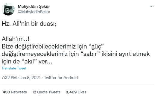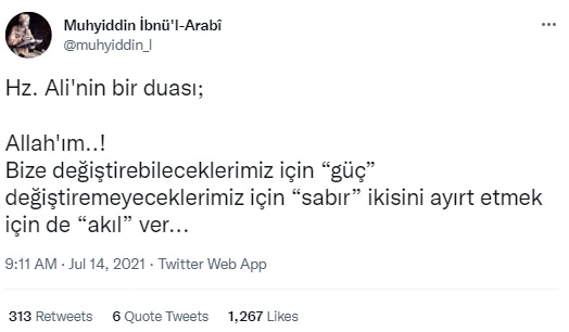 “Allah’ım..! Bize Değiştirebileceklerimiz için “güç” Değiştiremeyeceklerimiz için “sabır” İkisini ayırt etmek için de “Akıl” ver…” ifadelerinin sosyal medyada “Hz. Ali’nin bir duası” olduğu iddiasıyla paylaşıldığı görülüyor.