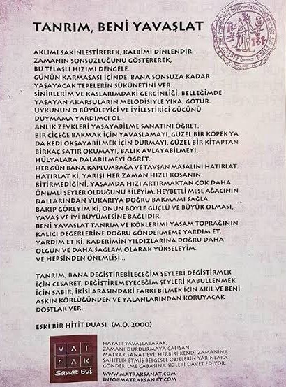 Geçmişte, M.Ö 2000’li yıllara ait bir Hitit duası olduğu iddiasıyla aktarılan (aşağıda alıntılanan) metinde yer alan bölümün sonradan Hz. Ali’ye atfedilerek paylaşıldığı görülüyor (Sözün Hititler döneminden kaldığına dair güvenilir bir kaynak atfına rastlayamadık. Paylaşılan metnin son bölümü hariç kısmının ABD’li düşünür ve yazar Wilfred A. Peterson’ın “Slow Me Down Lord” (“Tanrım Beni Yavaşlat”) adlı şiirinin dönüştürülmüş versiyonu olduğu anlaşılıyor).