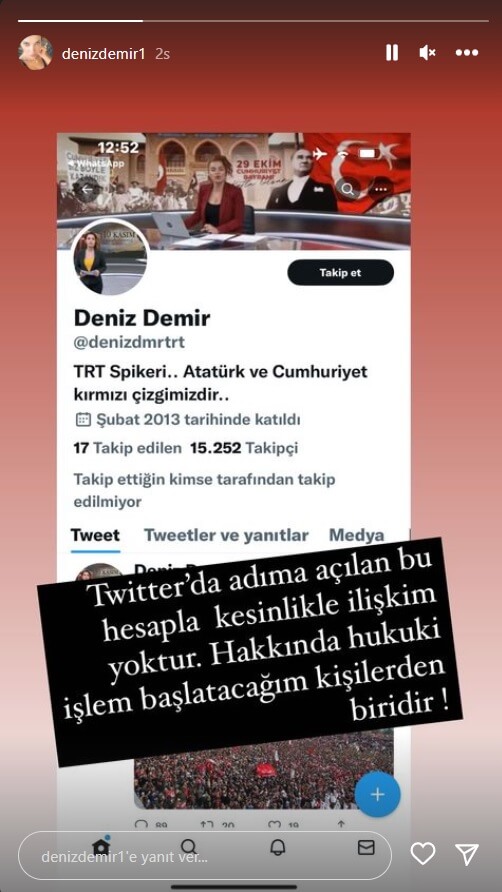 “Bu hesap Deniz Demir’e ait değil sahte hesap Deniz hanımın sarf ettiği düşünce, Türk Milletinin her ferdinin haykırarak dile getirdiği gerçekler ve minnet ettiğimiz Gazi Mustafa Kemal Atatürk’e duyulan özlemdir. TRT yönetimi malumumuz ancak yönetimin böyle bir tebligatı olmamış”