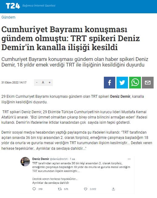 Bu sözlerinin ardından Deniz Demir’in 18 yıldır görev yaptığı TRT ile ilişiğinin kesildiğini Twitter üzerinden duyurulduğu iddiası basına yansıdı.