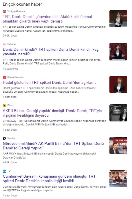 TRT Haber spikeri Deniz Demir, 29 Ekim mesajında kullandığı “Bizi ümmet olmaktan çıkarıp birey olma bilincini, Cumhuriyet aydınlığını ilmini armağan eden Gazi Mustafa Kemal Atatürk’ü ve tüm şehitlerimizi sevgi ve saygı ile anarken, Cumhuriyeti zihninde ve kalbi yaşatan bu büyük devlet büyük millet, Atatürk’ün kurduğu büyük Türkiye Cumhuriyeti ilelebet yaşasın. 29 Ekim Cumhuriyet Bayramımız kutlu olsun. Hoşçakalın” sözleriyle kamuoyunun dikkatini çekmişti.