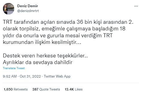 “TRT tarafından açılan sınavda 36 bin kişi arasından 2. olarak torpilsiz, emeğimle çalışmaya başladığım 18 yıldır da onurla ve gururla mesai verdiğim TRT kurumundan ilişkim kesilmiştir…