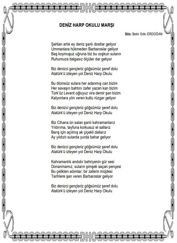 Deniz Harp Okulu Marşı‘nın Bekir Sıtkı Erdoğan tarafından kaleme alınan sözleri şöyle: