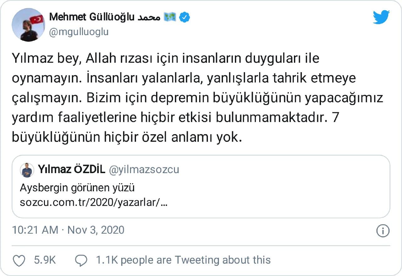 “Yılmaz bey, Allah rızası için insanların duyguları ile oynamayın. İnsanları yalanlarla, yanlışlarla tahrik etmeye çalışmayın. Bizim için depremin büyüklüğünün yapacağımız yardım faaliyetlerine hiçbir etkisi bulunmamaktadır. 7 büyüklüğünün hiçbir özel anlamı yok.”