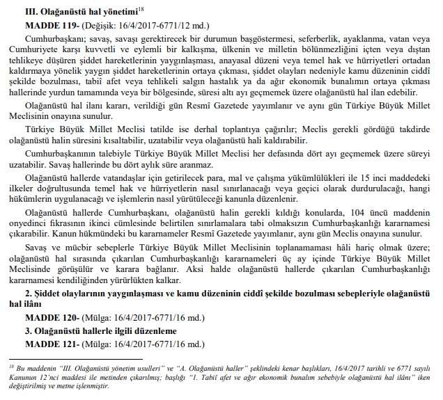 “Cumhurbaşkanı; savaş, savaşı gerektirecek bir durumun başgöstermesi, seferberlik, ayaklanma, vatan veya Cumhuriyete karşı kuvvetli ve eylemli bir kalkışma, ülkenin ve milletin bölünmezliğini içten veya dıştan tehlikeye düşüren şiddet hareketlerinin yaygınlaşması, anayasal düzeni veya temel hak ve hürriyetleri ortadan kaldırmaya yönelik yaygın şiddet hareketlerinin ortaya çıkması, şiddet olayları nedeniyle kamu düzeninin ciddî şekilde bozulması, tabiî afet veya tehlikeli salgın hastalık ya da ağır ekonomik bunalımın ortaya çıkması hallerinde yurdun tamamında veya bir bölgesinde, süresi altı ayı geçmemek üzere olağanüstü hal ilan edebilir.