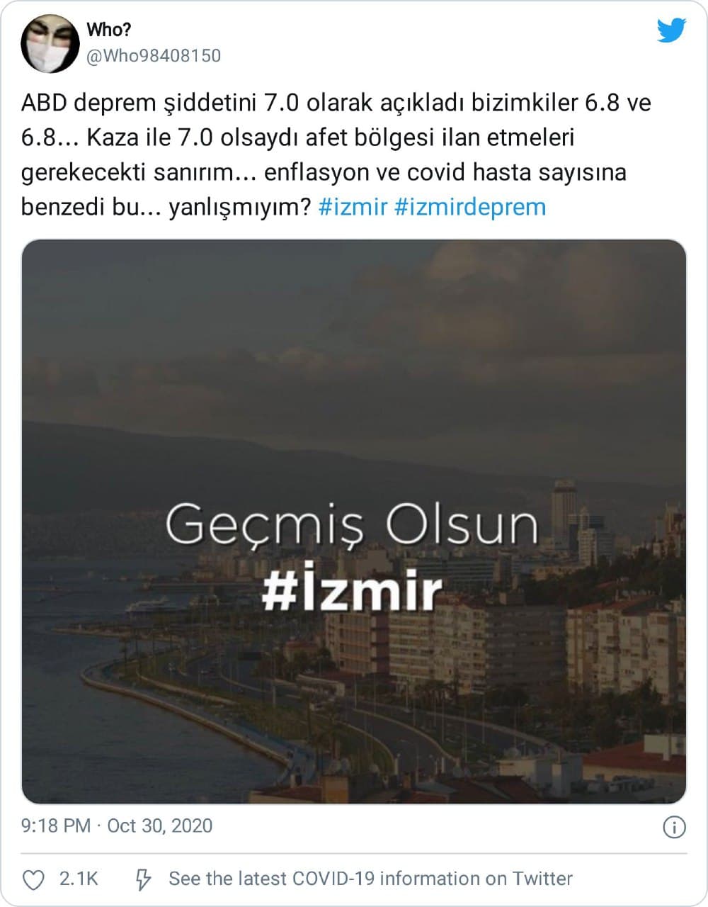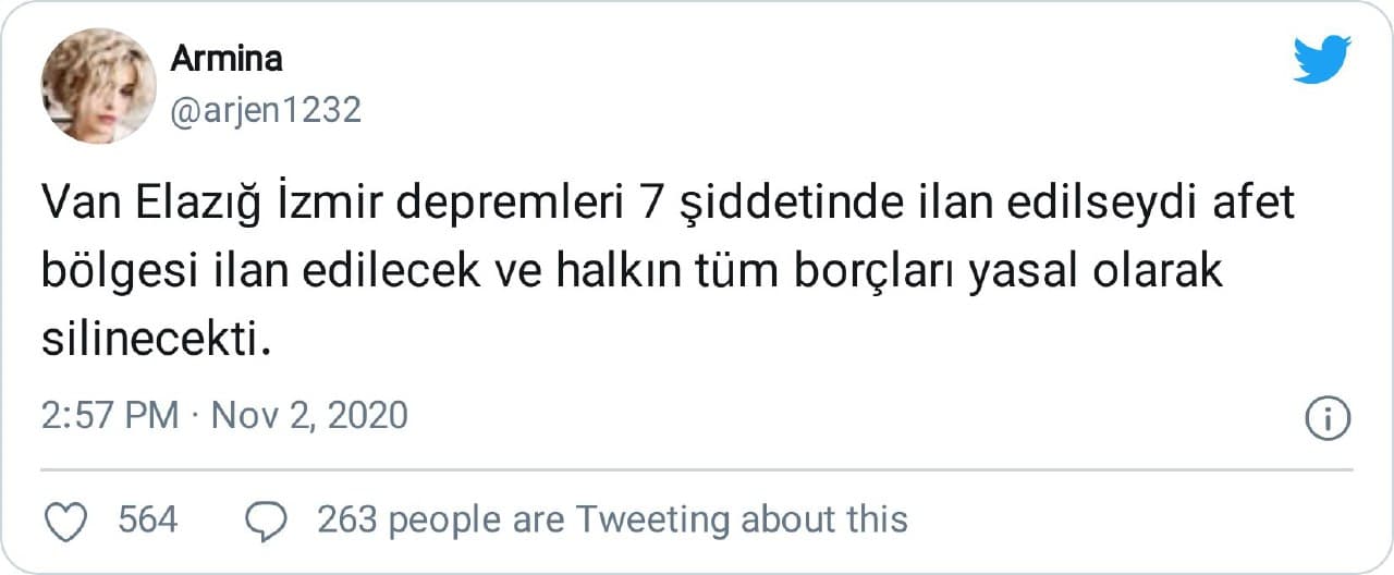 “ABD deprem şiddetini 7.0 olarak açıkladı bizimkiler 6.8 ve 6.8… Kaza ile 7.0 olsaydı afet bölgesi ilan etmeleri gerekecekti sanırım… enflasyon ve covid hasta sayısına benzedi bu… yanlışmıyım?”