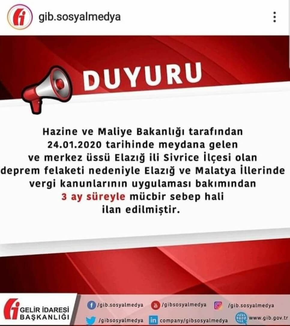 Deprem felaketi nedeniyle ilgili illerde vergi kanunlarının uygulanması bakımından kısıtlı süre ile mücbir sebep hâli ilân edilebilmektedir.