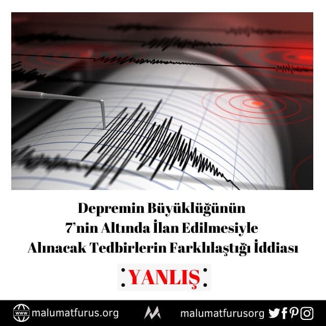 Bu yanlış iddiaya göre “depremin büyüklüğünün / şiddetinin 7,0 ya da 7,0’den büyük olması durumunda ilgili bölge “afet bölgesi” olarak ilân edilmeli, hükümet “olağanüstü hâl” (OHAL) ilân etmeli, afet bölgesindekilere vergi muafiyeti tanınmalı ve borçları silinmeli. Bu durumun getireceği yük nedeniyle de hükümet afet bölgesi ilan etmemek için 7,0 şiddetindeki depremlerin şiddetini düşürmekte“.