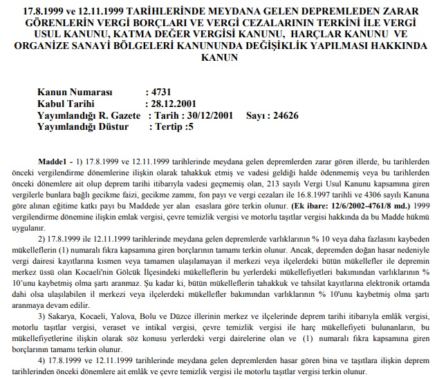 28 Aralık 2001 tarihli 4731 sayılı “17.8.1999 ve 12.11.1999 Tarihlerinde Meydana Gelen Depremlerden Zarar Görenlerin Vergi Borçları Ve Vergi Cezalarının Terkini İle Vergi Usul Kanunu, Katma Değer Vergisi Kanunu, Harçlar Kanunu Ve Organize Sanayi Bölgeleri Kanununda Değişiklik Yapılması Hakkında Kanun“un çeşitli vergilerin terkinine ilişkin ilk 2 maddesi şu şekilde idi: