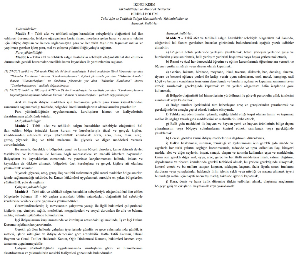 Doğal afet nedeniyle OHAL ilân edilmesi durumunda alınacak tedbirler ve yükümlülükler mezkur Kanun’un 5-9. maddelerinde belirtilmiştir. “Tabii Afet ve Tehlikeli Salgın Hastalıklarda Yükümlülükler ve Alınacak Tedbirler” başlıklı bölümde aktarılan hususlar arasında deprem büyüklüğünü içeren özel bir koşul yer almamaktadır.