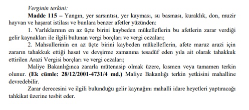 VUK’un 115. maddesinde deprem gibi afetler nedeniyle vergi borçları ve vergi cezalarının kısmen ya da tamamen silinebileceği hususu şöyle aktarılmıştır: