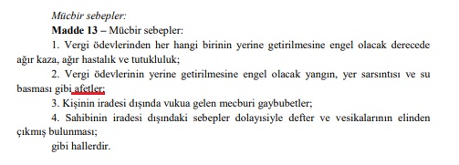 Vergi Usul Kanunu‘nun “Mücbir Sebepler” başlıklı 13. maddesinde vergi ödevinin yerine getirilmesine engel olabilecek afetlerin mücbir sebep olarak değerlendirilebileceği aktarılmıştır.