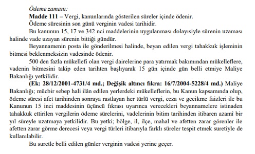 Deprem gibi afetler nedeniyle vergi ödemeleri konusunda mücbir sebep uygulaması ise Kanun’un 111. maddesinde şöyle detaylandırılmıştır: