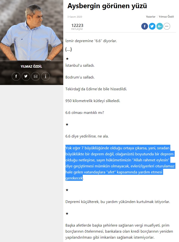 Yok eğer 7 büyüklüğünde olduğu ortaya çıkarsa, yani, sıradan büyüklükte bir deprem değil, olağanüstü boyutunda bir deprem olduğu netleşirse, sayın hükümetimizin “Allah rahmet eylesin” diye geçiştirmesi mümkün olmayacak, evleri/işyerleri oturulamaz hale gelen vatandaşlara “afet” kapsamında yardım etmesi gerekecek.