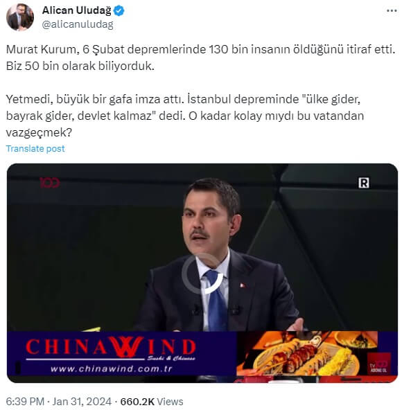 Alican Uludağ (@alicanuludag): “Murat Kurum, 6 Şubat depremlerinde 130 bin insanın öldüğünü itiraf etti. Biz 50 bin olarak biliyorduk. Yetmedi, büyük bir gafa imza attı. İstanbul depreminde “ülke gider, bayrak gider, devlet kalmaz” dedi. O kadar kolay mıydı bu vatandan vazgeçmek?”