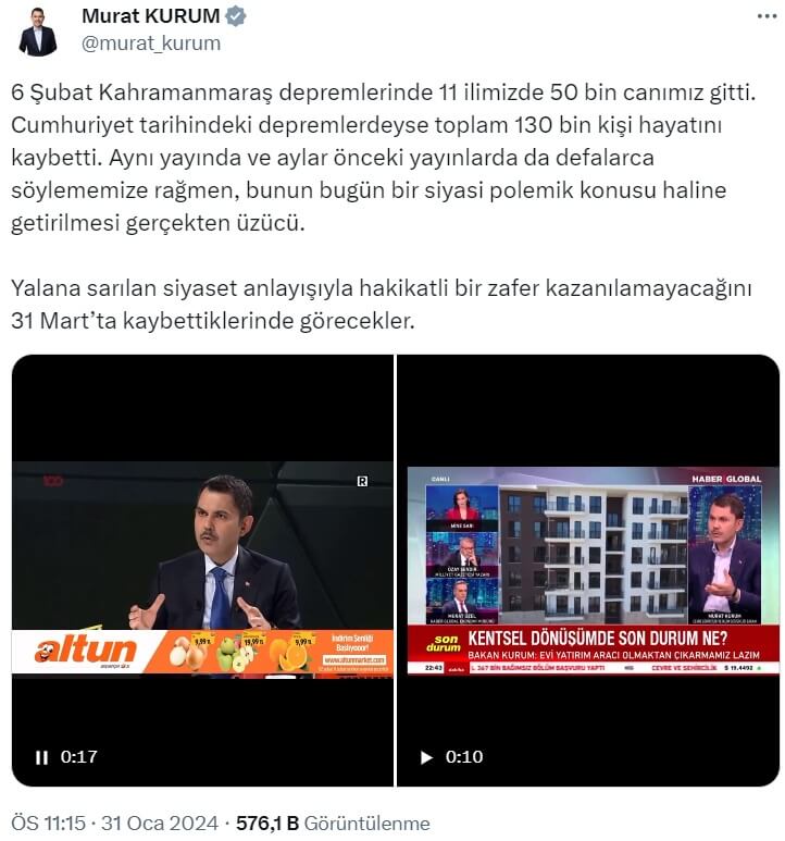 “6 Şubat Kahramanmaraş depremlerinde 11 ilimizde 50 bin canımız gitti. Cumhuriyet tarihindeki depremlerdeyse toplam 130 bin kişi hayatını kaybetti. Aynı yayında ve aylar önceki yayınlarda da defalarca söylememize rağmen, bunun bugün bir siyasi polemik konusu haline getirilmesi gerçekten üzücü. Yalana sarılan siyaset anlayışıyla hakikatli bir zafer kazanılamayacağını 31 Mart’ta kaybettiklerinde görecekler.”