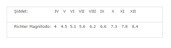 Aşağıdaki tabloda da depremin şiddet ve magnitüd değerleri arasındaki dönüşümler görülebilir: