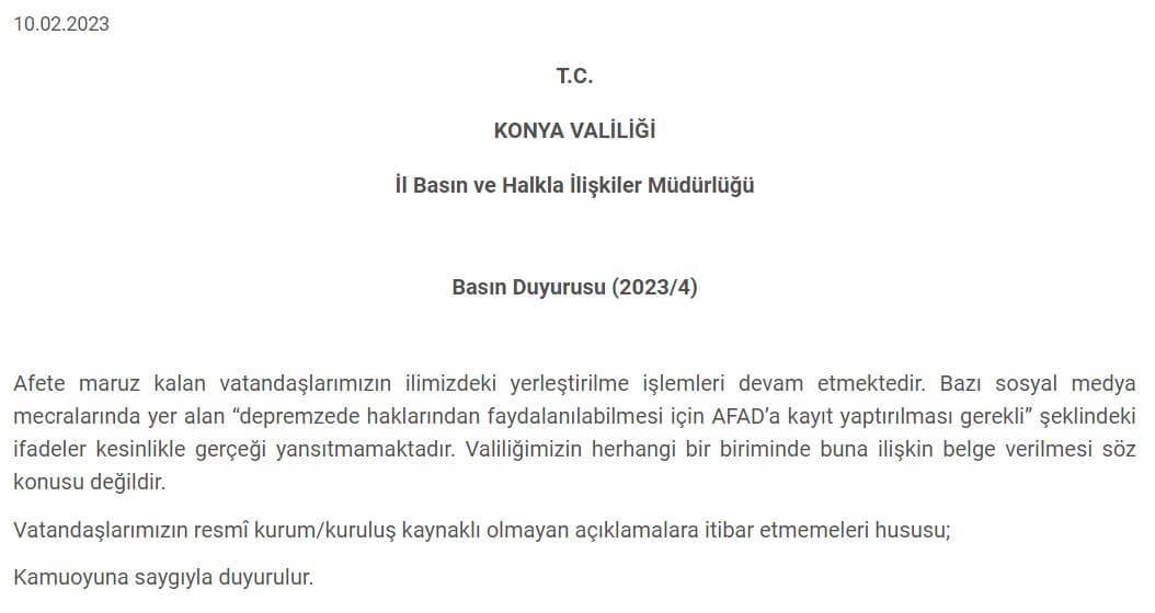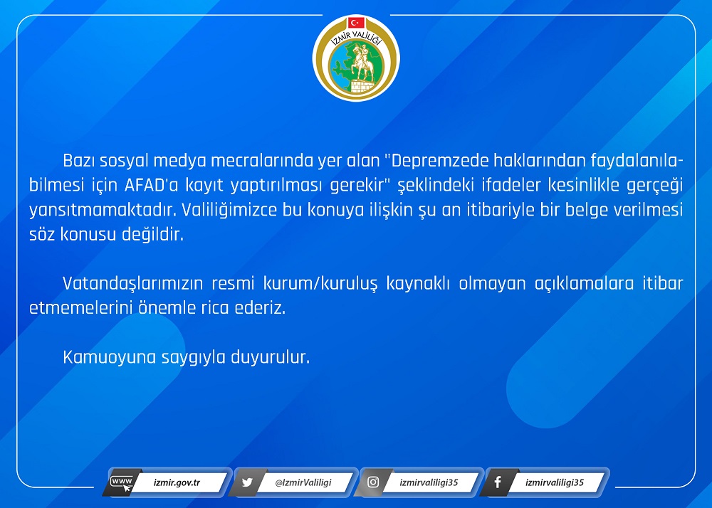 Afete maruz kalan vatandaşlarımızın ilimizdeki yerleştirilme işlemleri devam etmektedir. Bazı sosyal medya mecralarında yer alan “depremzede haklarından faydalanılabilmesi için AFAD’a kayıt yaptırılması gerekli” şeklindeki ifadeler kesinlikle gerçeği yansıtmamaktadır. Valiliğimizin herhangi bir biriminde buna ilişkin belge verilmesi söz konusu değildir.