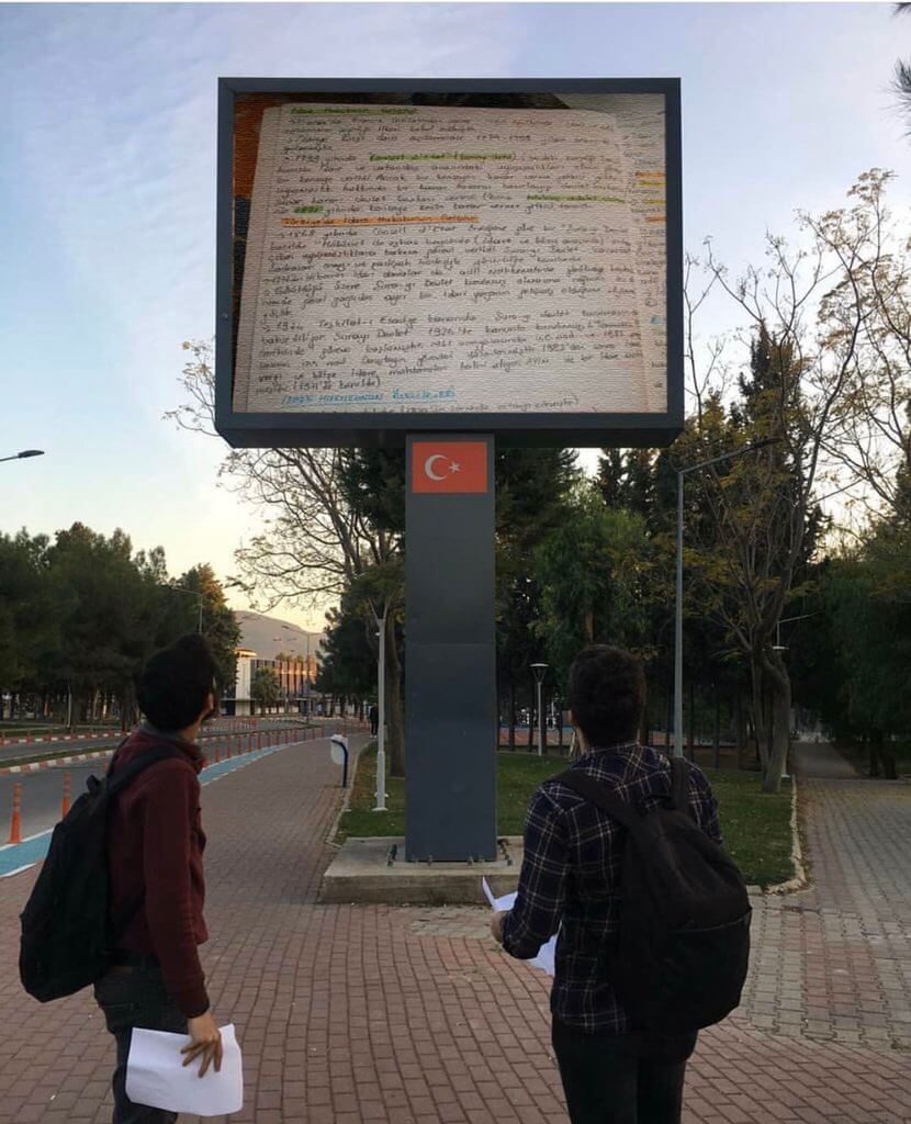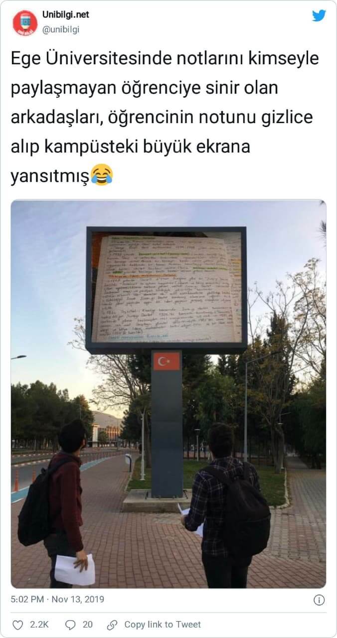 “Ege Üniversitesi’nde notlarını kimse ile paylaşmayan öğrenciye sinir olan arkadaşları, öğrencinin notunu gizlice alıp kampüsteki ekrana yansıtmış, gelen geçen notları geçiriyor.”