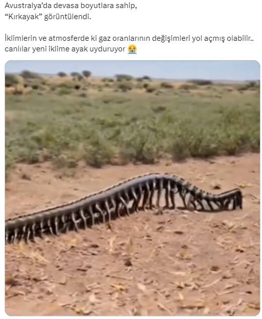 Dr. Esmeralda (@Esmeral42507697): “Avustralya’da devasa boyutlara sahip, “Kırkayak” görüntülendi. İklimlerin ve atmosferde ki gaz oranlarının değişimleri yol açmış olabilir.. canlılar yeni iklime ayak uyduruyor “