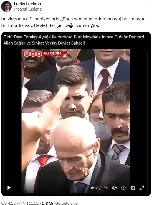 Lucky Luciano (@sansliluciano): “bu videonun 12. saniyesinde güneş yansımasından makyaj belli oluyor. Bir tuhaflık var.. Devlet Bahçeli değil Dublör gibi.”