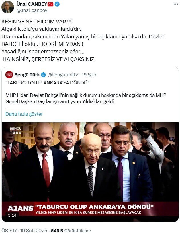 Ünal Canbey: “Kesin ve net bilgim var!!! Alçaklık ölü’ü saklayanlarda’dır. Utanmadan sıkılmadan yalan yanlış bir açıklama yapılsa da Devlet BAHÇELİ öldü. HODRİ MEYDAN! Yaşadığını ispat etmezseniz eğer,,, HAİNSİNİZ, ŞERESİZ VE ALÇAKSINIZ”