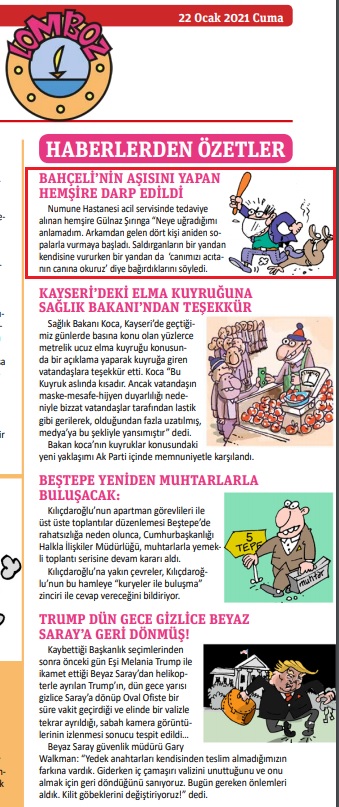 Devlet Bahçeli’ye aşı yapan hemşirenin saldırganlar tarafından “canımızı acıtanın canına okuruz” diye bağırdığını aktaran Gazete Pencere’deki “Haberlerden Özetler” başlıklı bölüm, karikatürist İ. Bülent Çelik’in Lomboz başlıklı köşesinin parodi haberler paylaştığı kısmındandı.