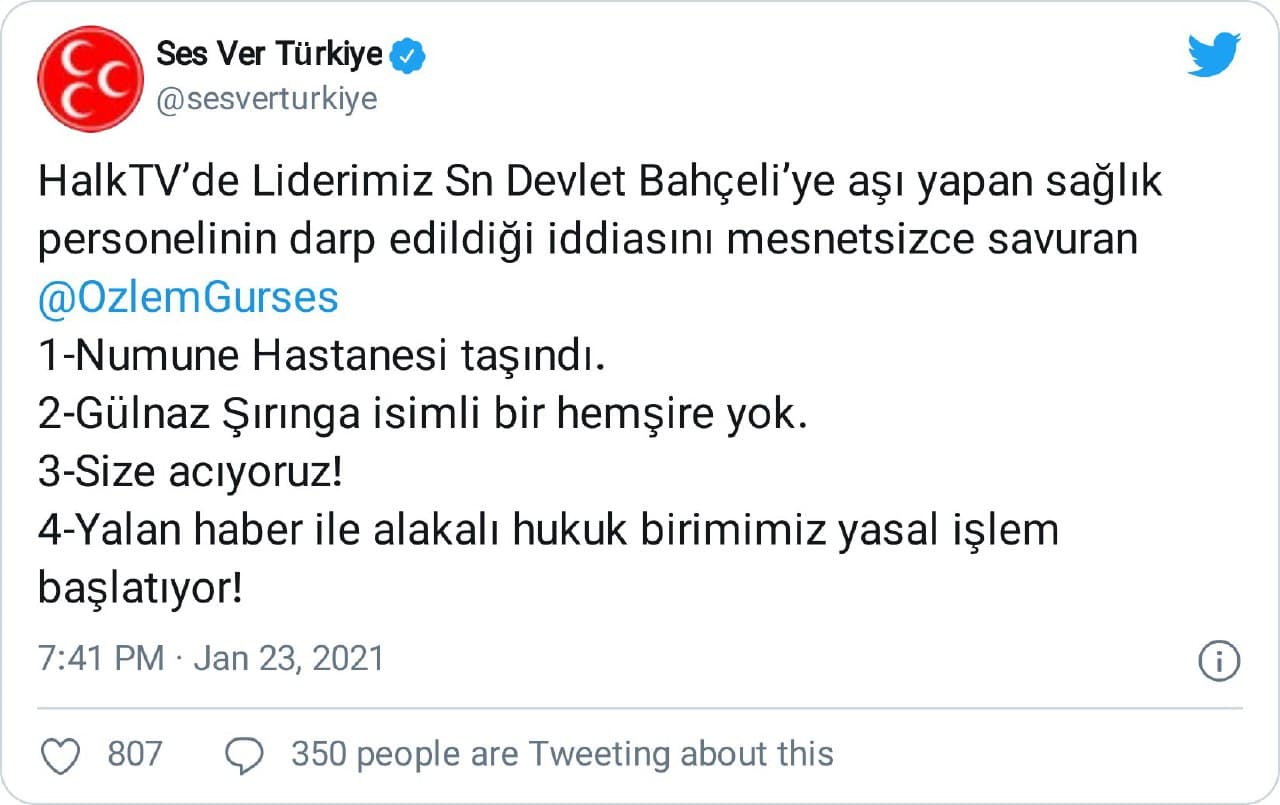 “Olay şu: Gülnaz Şırınga adlı bir fake hesap, hemşire olduğunu, MHP lideri Devlet Bahçeli’nin Covid aşısını yaptığını ve Bahçeli’nin canı acıdığı için korumaları tarafından tartaklandığını yazmıştı. Özlem Gürses de bunu gerçekmiş gibi anlatmıştı. Paylaşımcı ‘hemşire’nin soyadının Şırınga olmasından bile çıkarımda bulunamayacak bir zekâ kapasitesine sahipti ne yazık ki.”