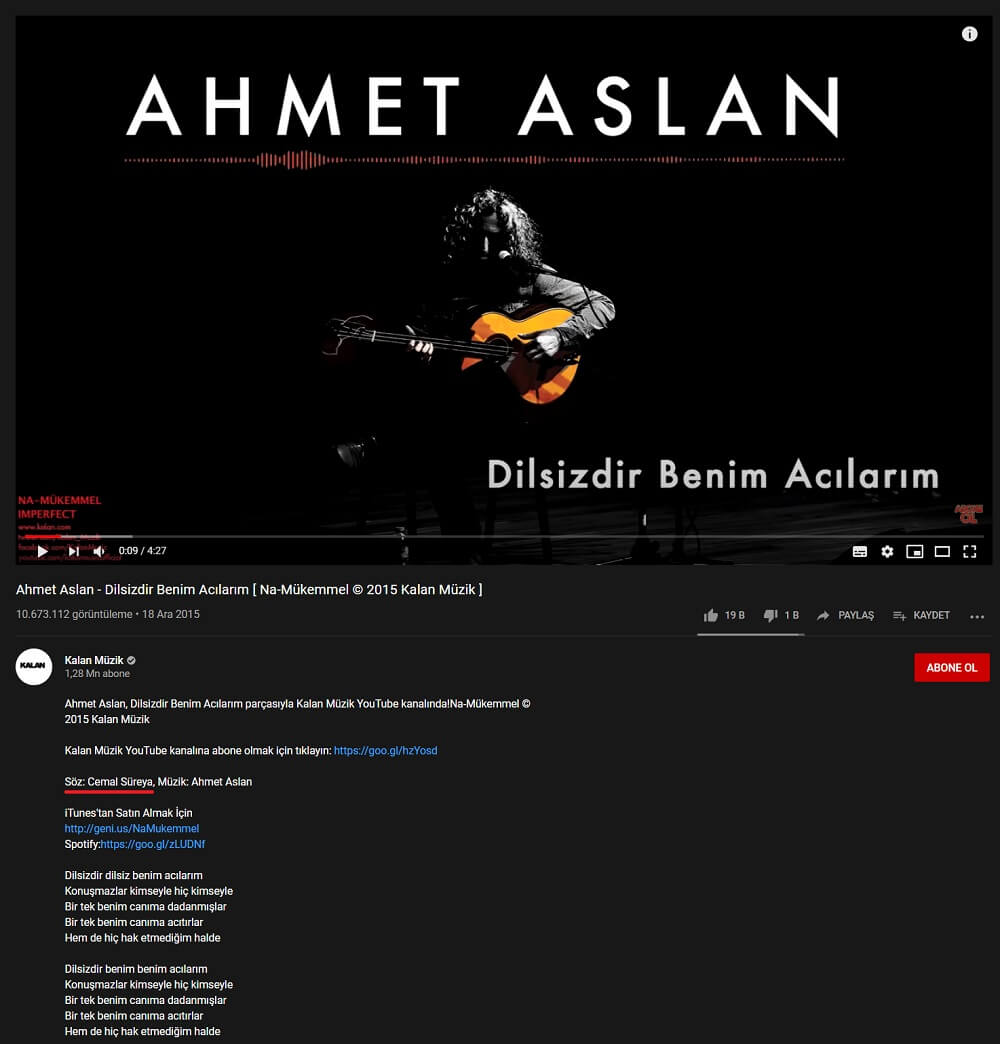 Anılan albümünün tanıtım metninde “Mızrapsız sazı, Cemal Süreyya’nın dilsiz şarkılarını çalar” ifadesi kullanılan Ahmet Aslan’ın “Dilsizdir Benim Acılarım” şiirinin Cemal Süreya’ya ait olduğunu iddia ettiği görülmektedir.