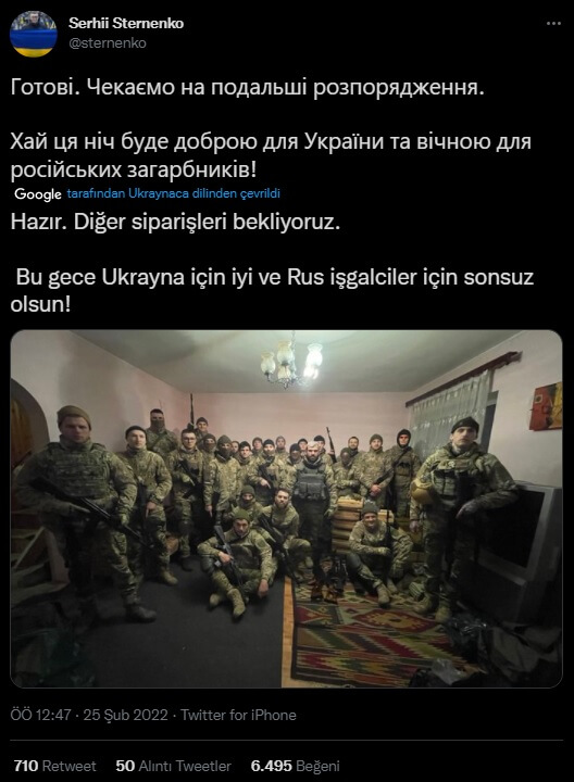 Ukraynalı aktivist Serhii Sternenko, söz konusu fotoğrafı “Hazır. Diğer siparişleri bekliyoruz. Bu gece Ukrayna için iyi ve Rus işgalciler için sonsuz olsun!” notuyla Twitter hesabında paylaşmıştı.