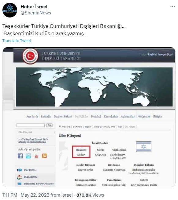 Haber İsrael (@ShemaNews): “Teşekkürler Türkiye Cumhuriyeti Dışişleri Bakanlığı… Başkentimizi Kudüs olarak yazmış…”